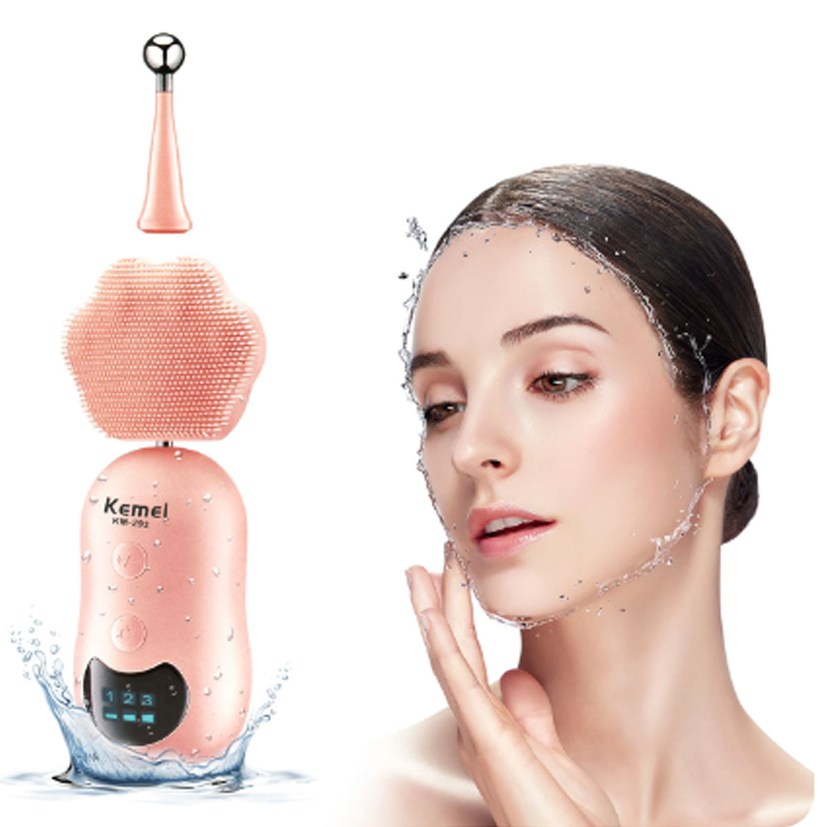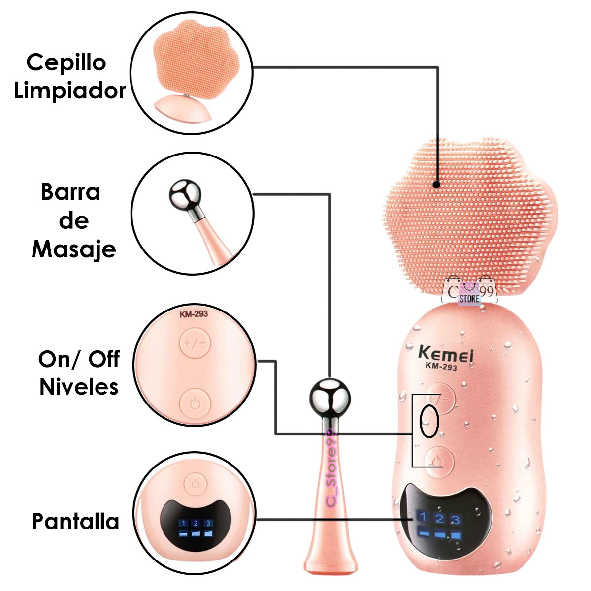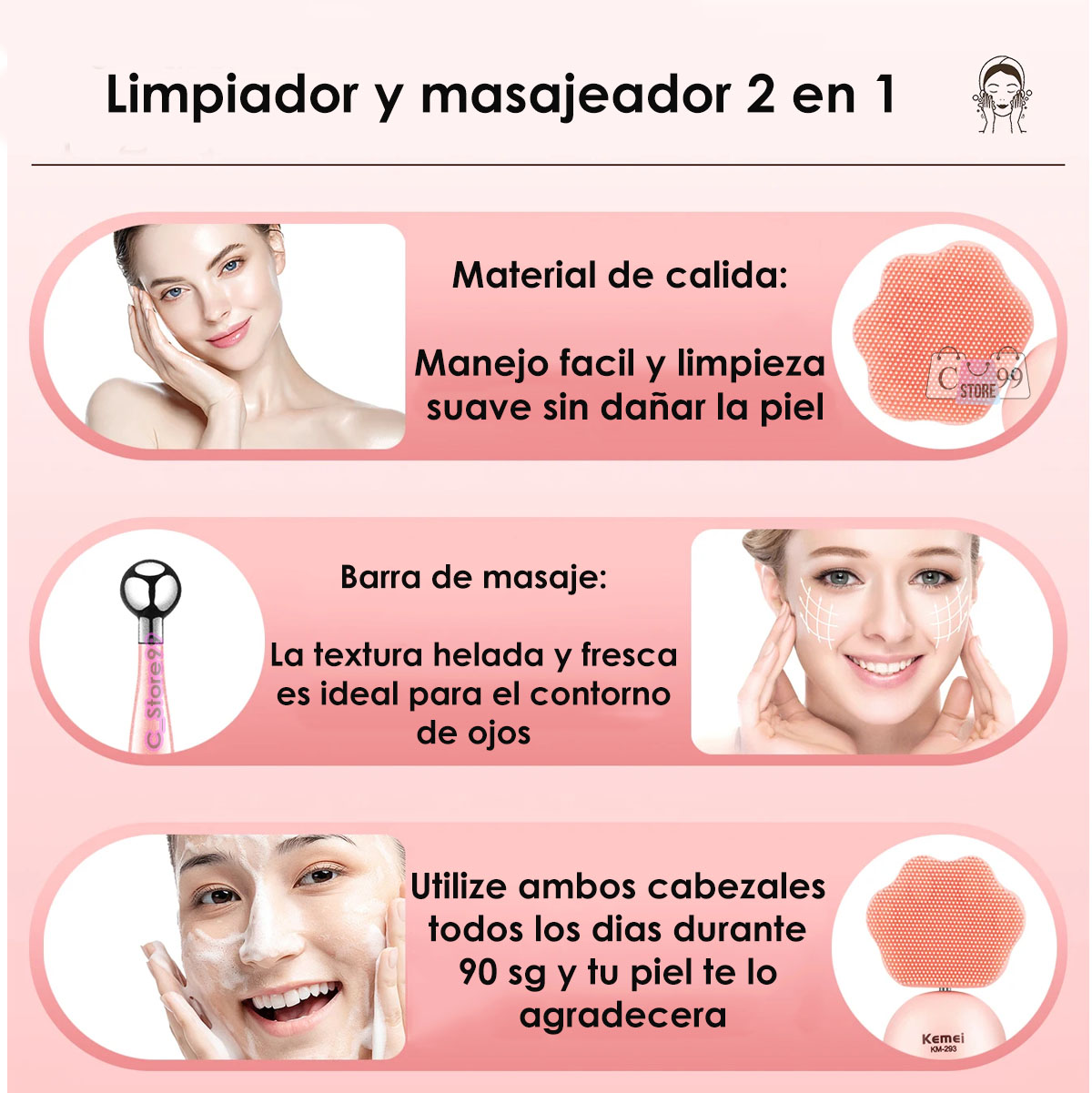 Moje su rostro y aplique el producto de limpieza de su elección. Presione el botón de Encendido para encender el dispositivo, después de su uso, enjuáguese la cara con agua.